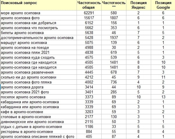 Вот позиции по основным запросам с частотностью по Вордстату по Архипо-Осиповке.